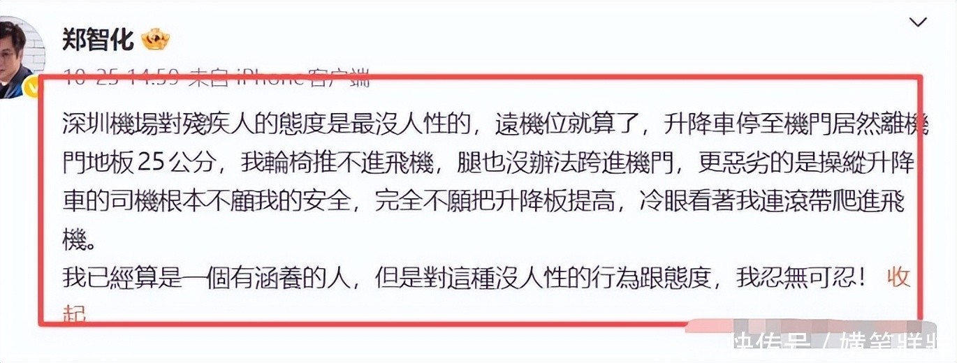 郑智化机场吐槽反被锤二十五号那天,深圳机场因郑智化闹出点动静,他在社交平台发了文,说机场对待残疾人的做法太不像话。