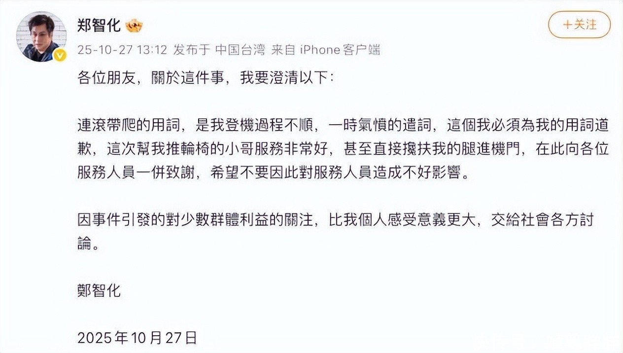 对着铁证郑智化没法子,只好又发了个文道歉,说 “连滚带爬” 是自己当时太生气,说的气话,他还承认推轮椅的工作人员态度其实挺好,可这份道歉来得晚,还显得不诚心,大家根本不买账。